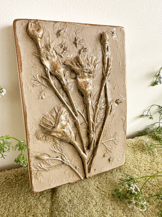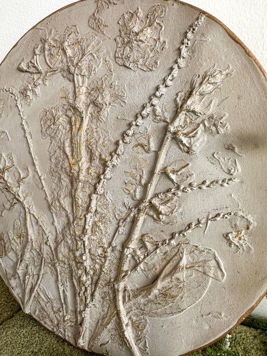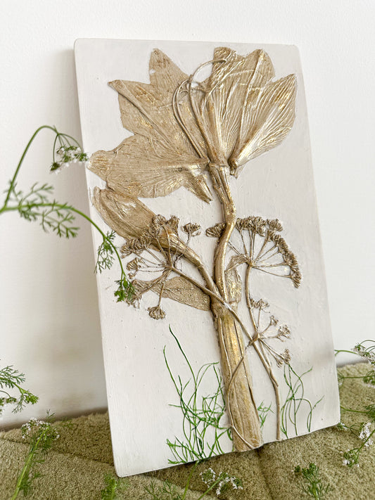 Botanical Casting is a technique that captures the detailed impressions of real plants. Flowers or leaves are pressed into clay, then cast in plaster of Paris to create beautiful, lasting artworks. Each piece highlights the natural beauty and unique details of the plants.