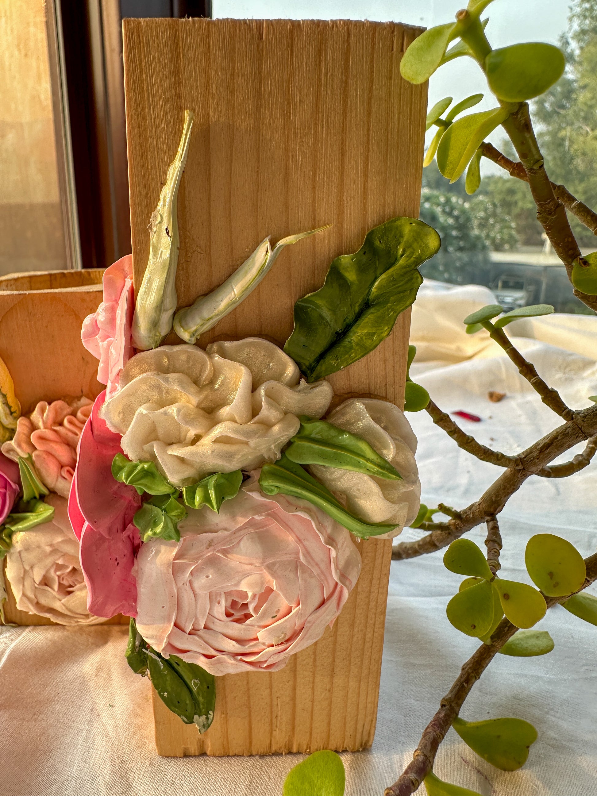 Each votive is finished with hand-piped acrylic floral detailing, built up slowly to create layered surfaces and subtle depth. Intended to be used and lived with, they balance decoration with function, settling naturally into both everyday and occasional settings.