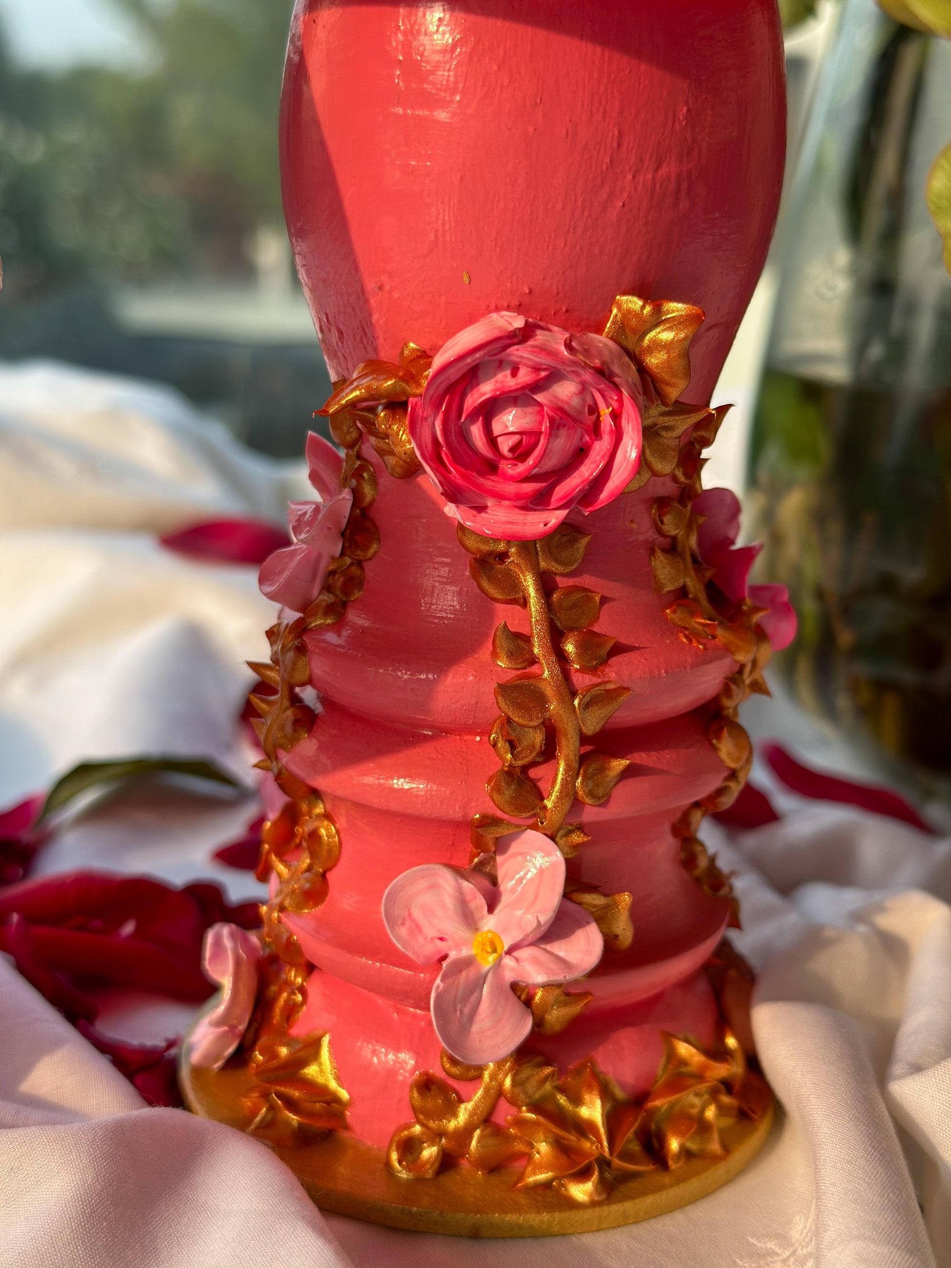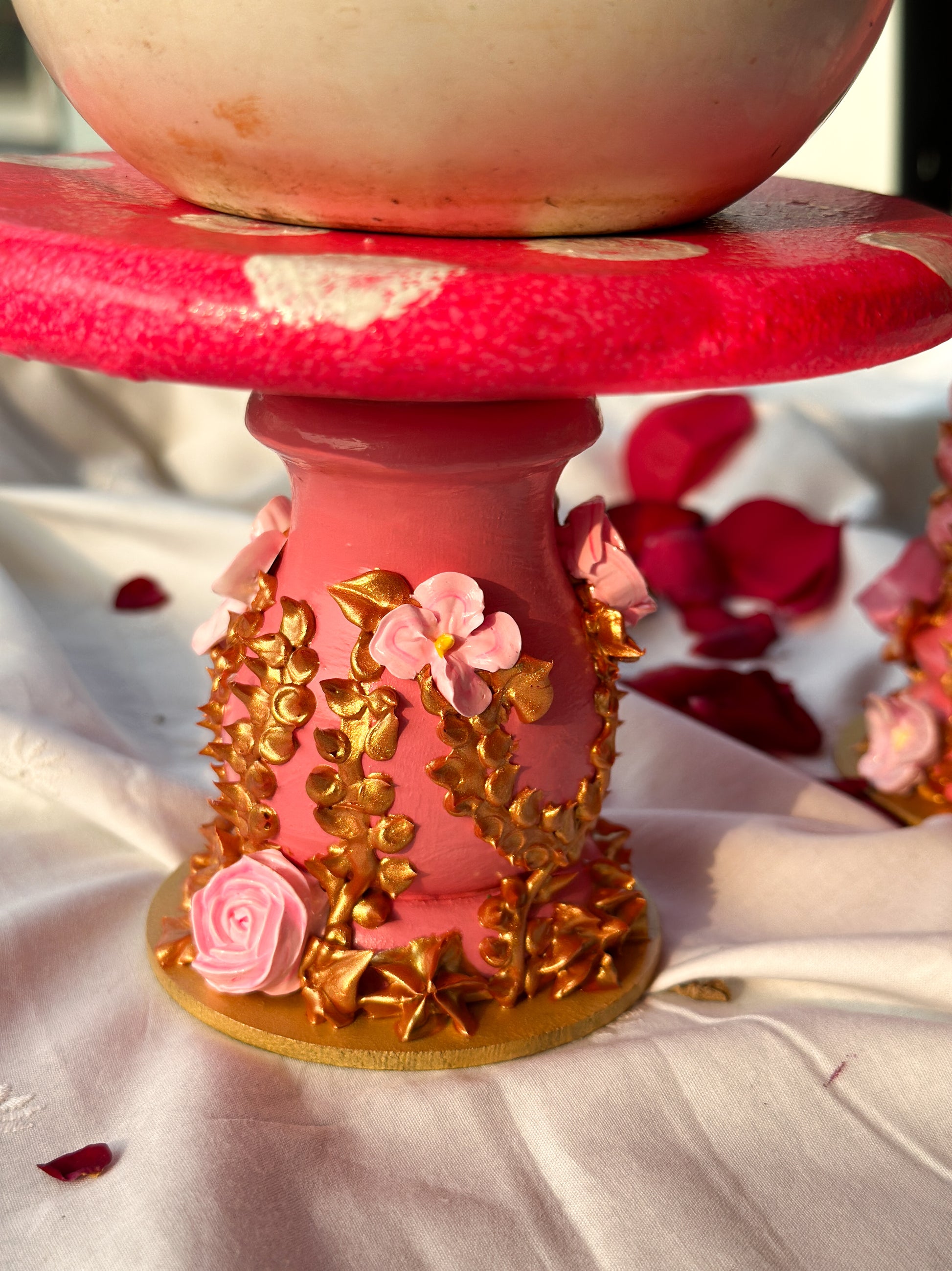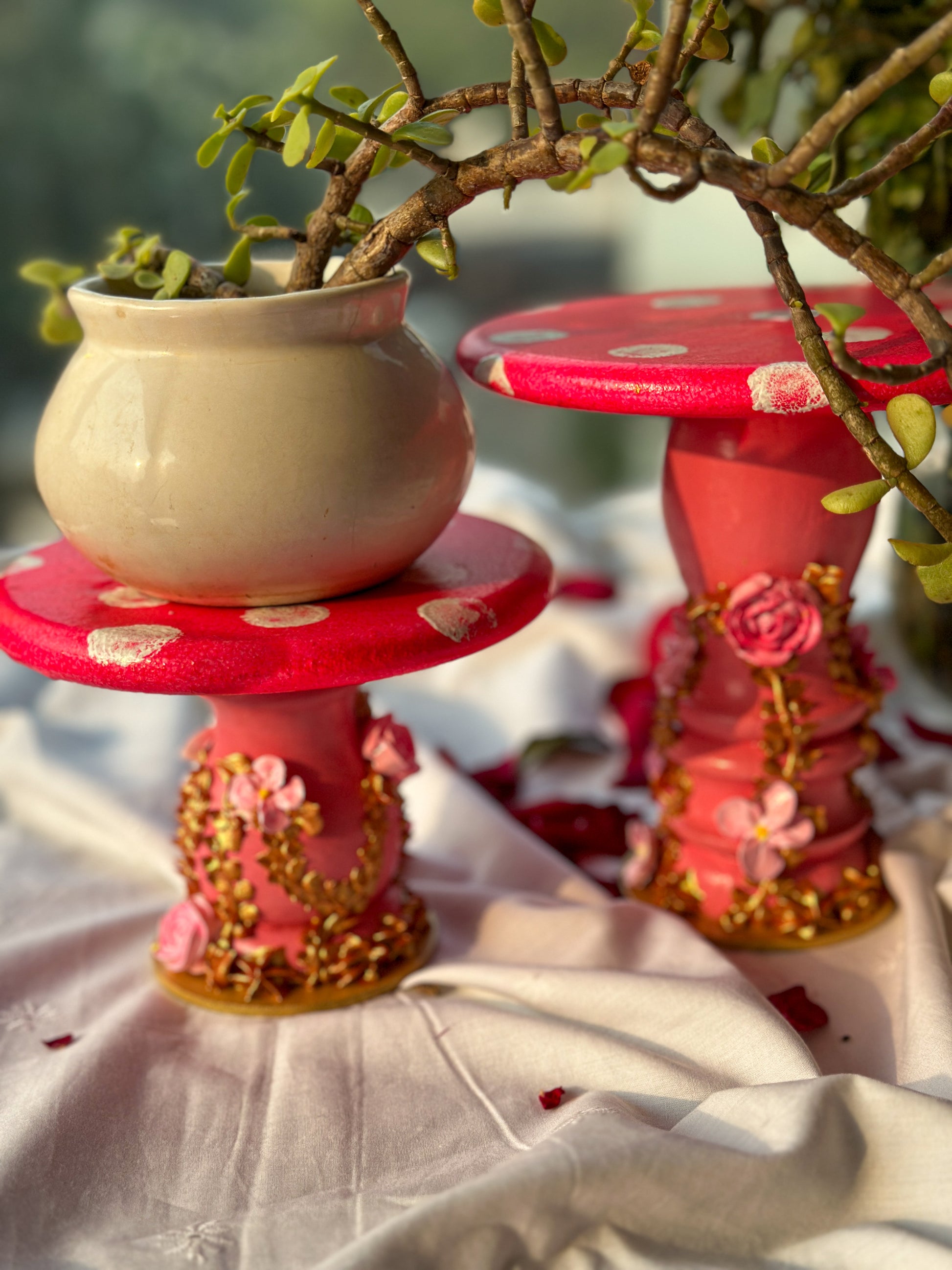 The set includes one taller and one shorter toadstool, designed to sit comfortably together. Built up through layered texture work and finished with tiny hand-piped pink flowers, the surfaces feel lively and detailed, inviting a closer look. Whether styled on a shelf, console, or tabletop, they add character and a quiet sense of fun to a space.